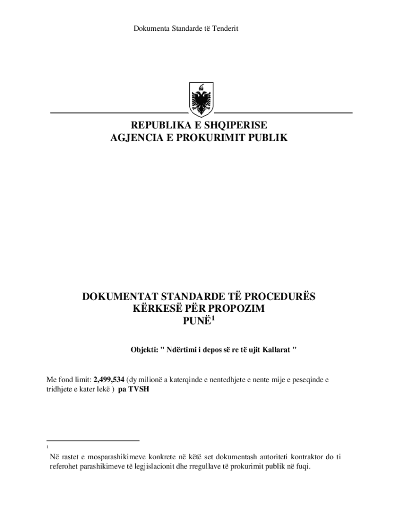 Dokumenta Standarde t TenderitREPUBLIKA E SHQIPERISE AGJENCIA E PROKURIMIT PUBLIKDOKUMENTAT STANDARDE T PROCEDURS KRKES PR PROPOZIM PUN1 Objekti: \" Ndrtimi i depos s re t ujit Kallarat \"Me fond