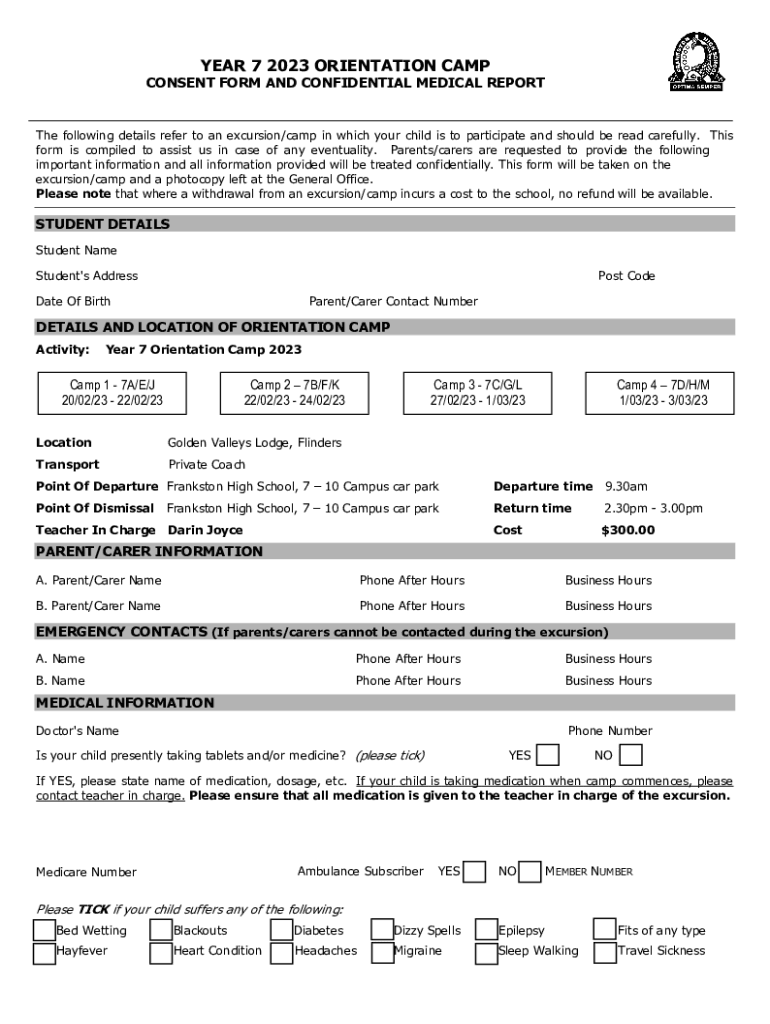Get the free Year 7 2020 Camp Consent and Medical Form STAV