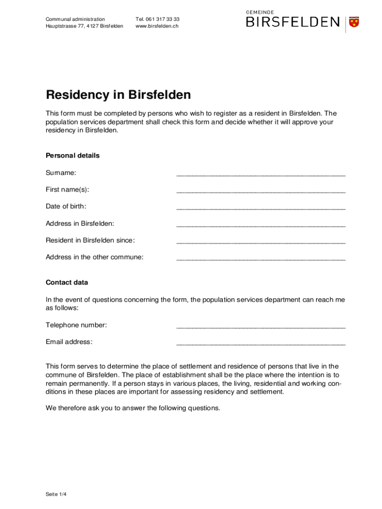 Communal administration Hauptstrasse 77, 4127 BirsfeldenTel. 061 317 33 33 www.birsfelden.chResidency in Birsfelden This form must be completed by persons who wish to register as a resident in Birsfelden.