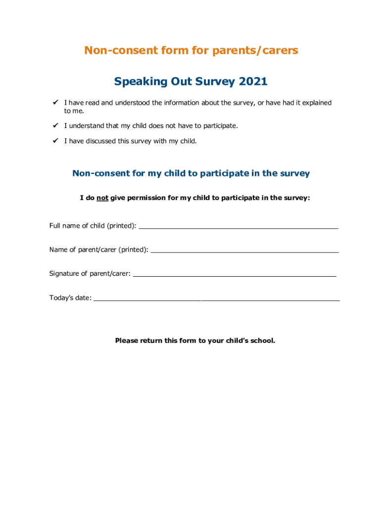 Nonconsent form for parents/carers Speaking Out Survey 2021 I have read and understood the information about the survey, or have had it explained to me. I understand that my child does not have to