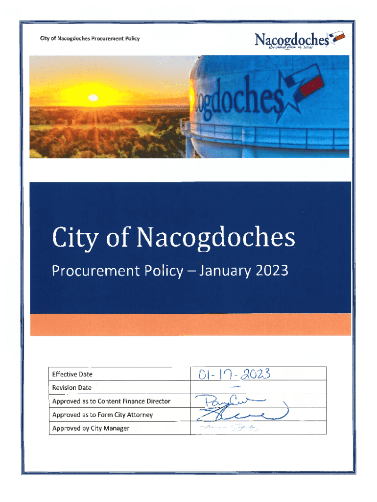 City of Nacogdoches Procurement PolicyThis page intentionally left blankCity of Nacogdoches Procurement PolicyCity of Nacogdoches ContactsCity Attorney9365592503City Secretary9365592506Finance Director9365592526Assistant