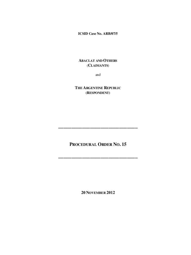 ICSID Case No. ARB/07/5ABACLAT AND OTHERS (CLAIMANTS) andTHE ARGENTINE REPUBLIC (RESPONDENT)___PROCEDURAL ORDER NO. 15___20 NOVEMBER 2012CONSIDERING 1.The Arbitral Tribunal refers to Procedural Order
