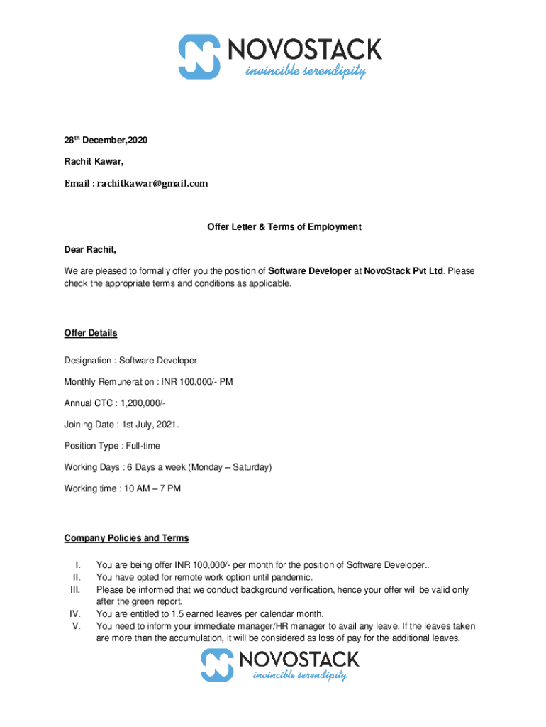 28th December,2020 Rachit Kawar,Email : rachitkawar@gmail.comOffer Letter & Terms of Employment Dear Rachit, We are pleased to formally offer you the position of Software Developer at NovoStack Pvt