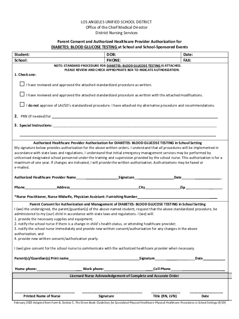 LOS ANGELES UNIFIED SCHOOL DISTRICT Office of the Chief Medical Director District Nursing Services Parent Consent and Authorized Healthcare Provider Authorization for DIABETES: BLOOD GLUCOSE TESTING