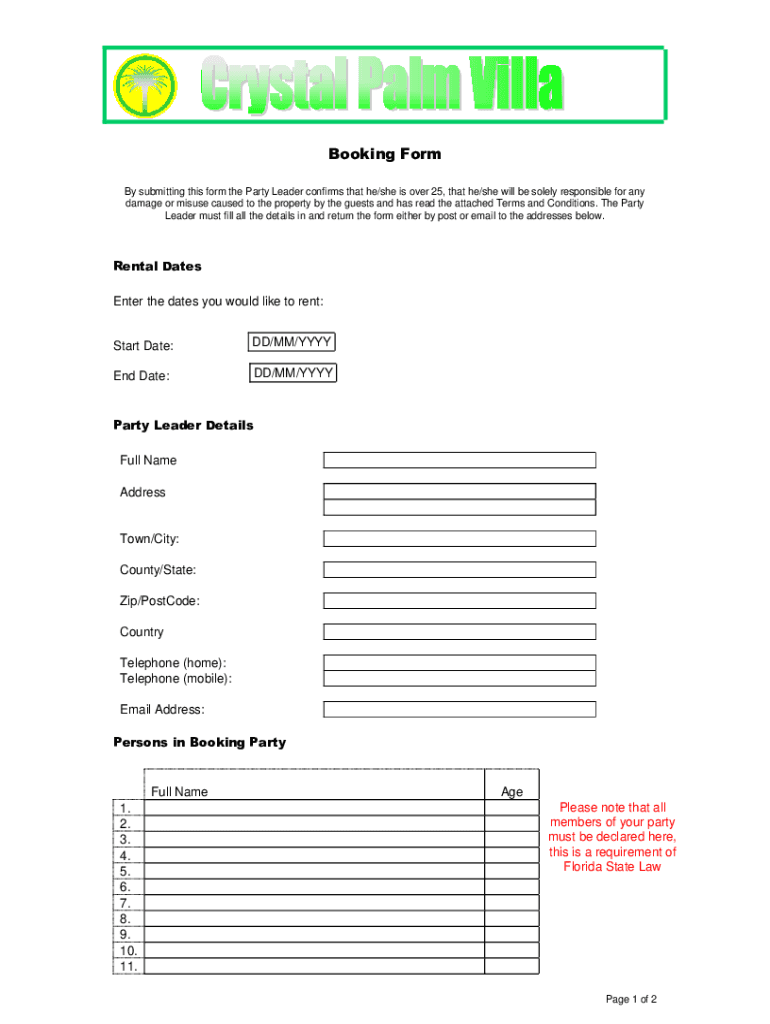 Booking Form By submitting this form the Party Leader confirms that he/she is over 25, that he/she will be solely responsible for any damage or misuse caused to the property by the guests and has