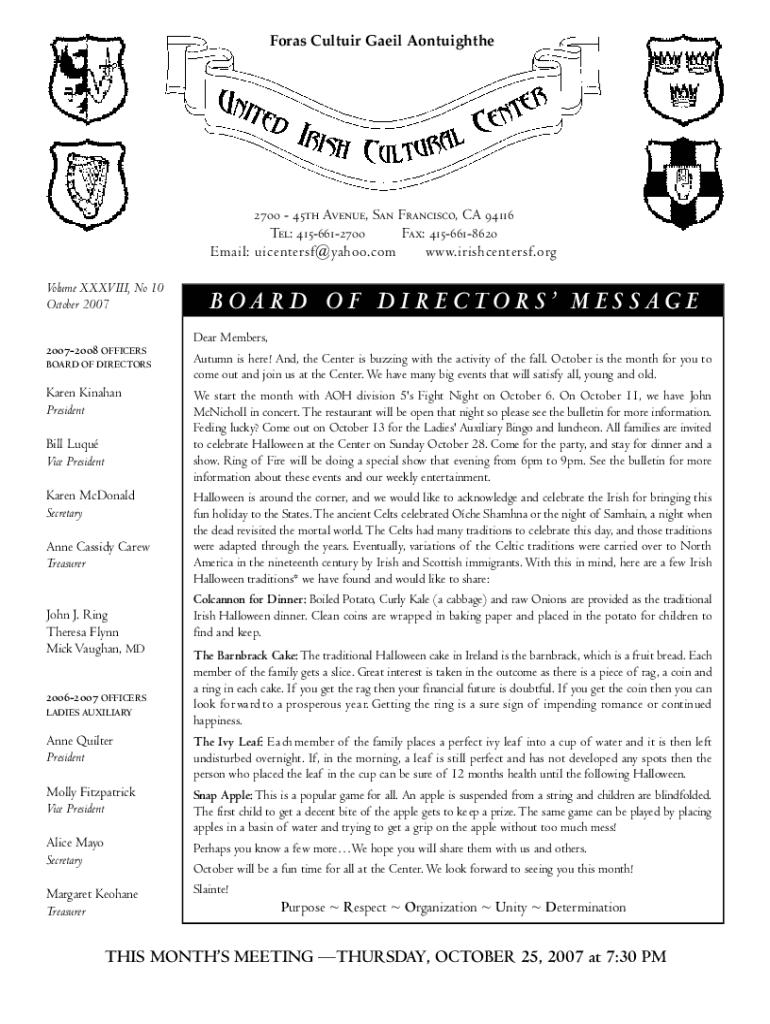 Foras Cultuir Gaeil Aontuighthe2700 45th Avenue, San Francisco, CA 94116 Tel: 4156612700 Fax: 4156618620 Email: uicentersf@ya h o o.com www. i r i s h c e n t e r s f. o rg Volume XXXVIII, No 10 October