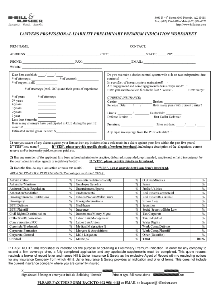 3033 N 44th Street #300 Phoenix, AZ 85018 Fax: (602) 9564418 Main (602) 9564220 http://www.hillusher.comLAWYERS PROFESSIONAL LIABILITY PRELIMINARY PREMIUM INDICATION WORKSHEET FIRM NAME: ___ CONTACT: