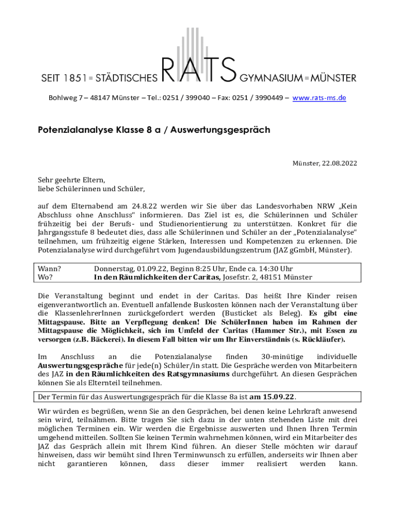 Bohlweg 7 48147 Mnster Tel.: 0251 / 399040 Fax: 0251 / 3990449 www.ratsms.dePotenzialanalyse Klasse 8 a / AuswertungsgesprchMnster, 22.08.2022Sehr geehrte Eltern, liebe Schlerinnen und Schler, auf