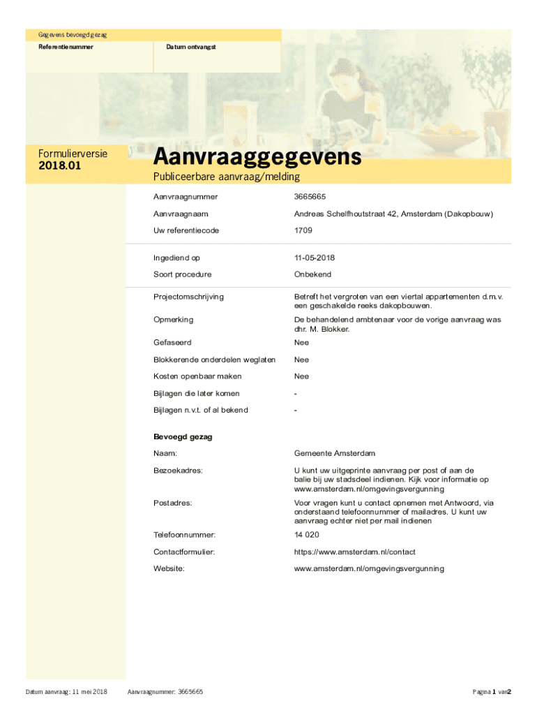 Gegevens bevoegd gezag ReferentienummerFormulierversie 2018.01Datum ontvangstAanvraaggegevens Publiceerbare aanvraag/melding Aanvraagnummer3665665AanvraagnaamAndreas Schelfhoutstraat 42, Amsterdam