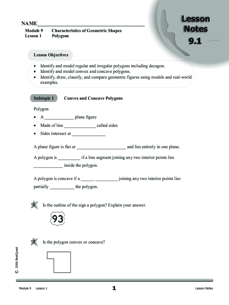 NAME___ Module 9 Lesson 1Characteristics of Geometric Shapes PolygonsLesson Notes 9.1Lesson Objectives Identify and model regular and irregular polygons including decagon. Identify and model convex