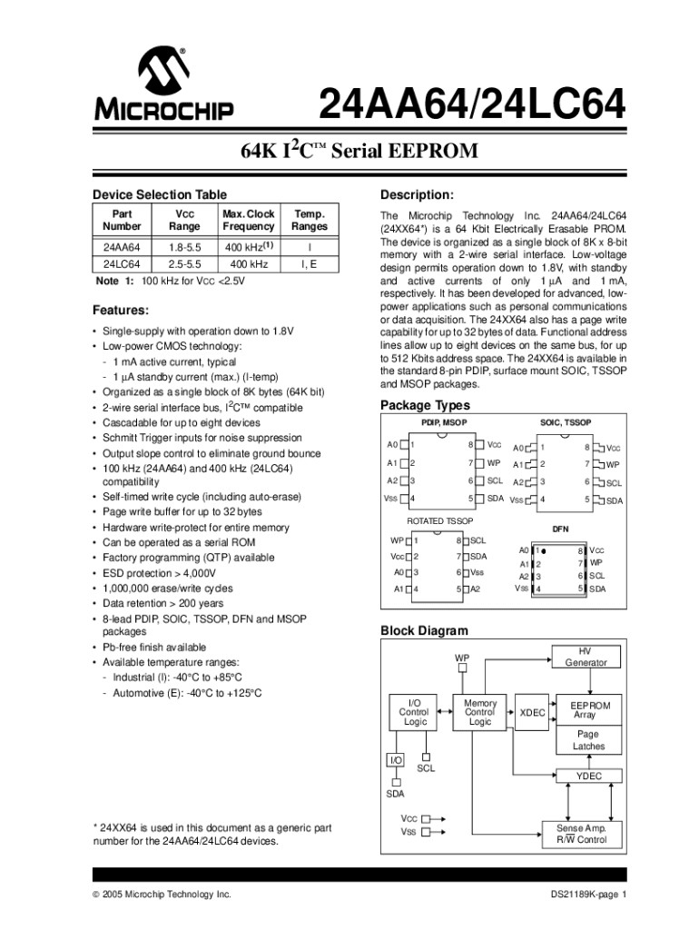 Ranges24AA641.85.5400 kHz(1)I24LC642.55.5400 kHz, Note 1: 100 kHz for VCC 2.5VFeatures: