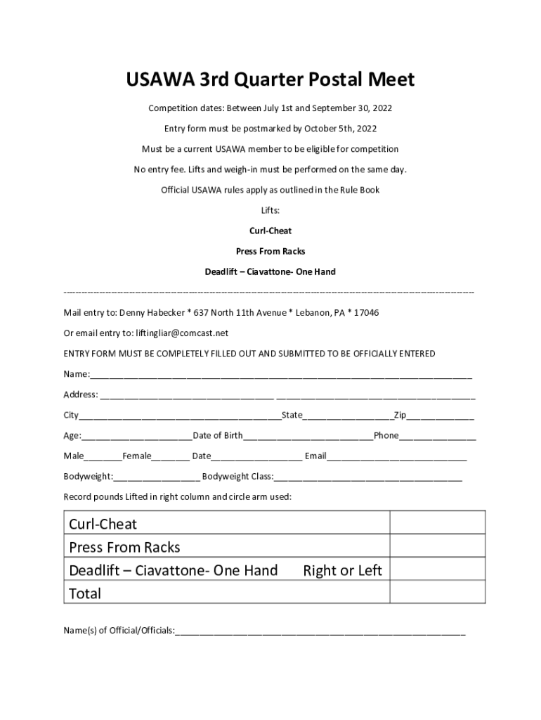 USAWA 3rd Quarter Postal Meet Competition dates: Between July 1st and September 30, 2022 Entry form must be postmarked by October 5th, 2022 Must be a current USAWA member to be eligible for competition