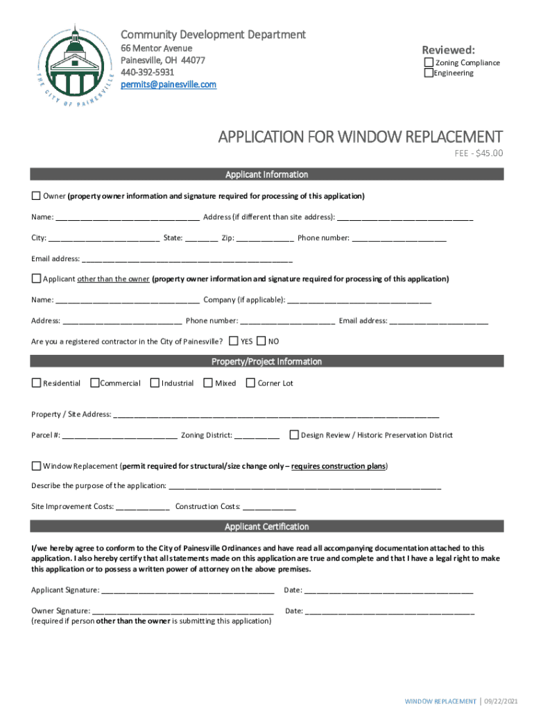 Community Development Department 66 Mentor Avenue Painesville, OH 44077 4403925931 permits@painesville.comReviewed: Zoning Compliance EngineeringAPPLICATION FOR WINDOW REPLACEMENT FEE $45.00 Applicant