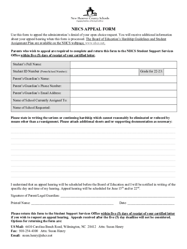 NHCS APPEAL FORM Use this form to appeal the administrations denial of your open choice request. You will receive additional information about your appeal hearing when this form is processed. The