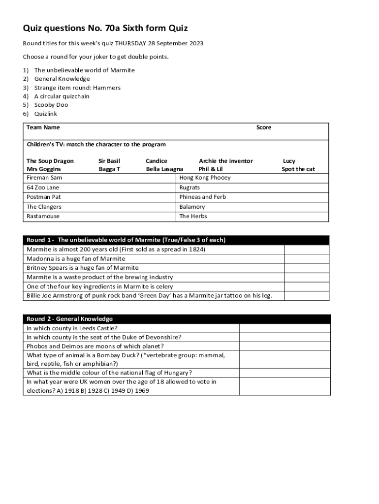 Get the free Quiz questions No. 70a Sixth form Quiz