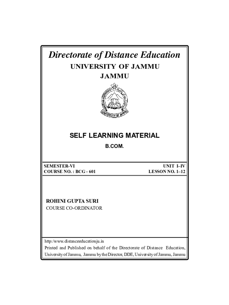 Directorate of Distance Education UNIVERSITY OF JAMMU JAMMUSELF LEARNING MATERIAL B.COM. SEMESTERVI COURSE NO. : BCG 601UNIT IIV LESSON NO. 112ROHINI GUPTA SURI COURSE COORDINATORhttp:/www.distanceeducationju.in
