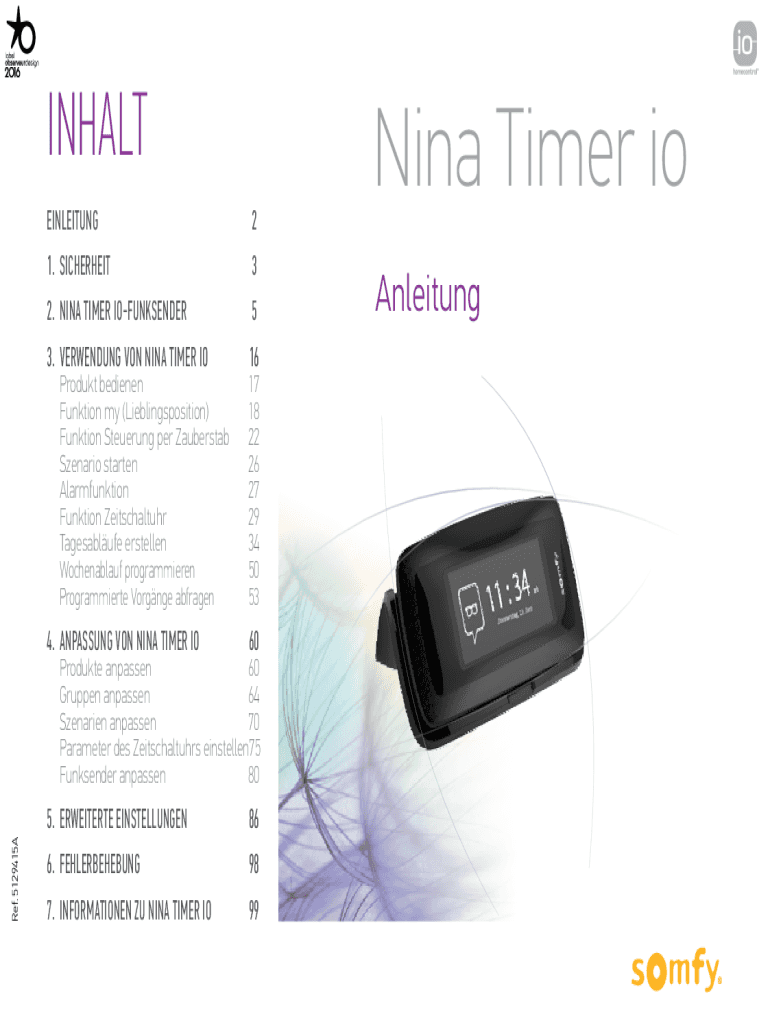 INHALTNina TimerioEINLEITUNG 2 1. SICHERHEIT32.NINA TIMER IOFUNKSENDER53.VERWENDUNG VON NINA TIMERIOProdukt bedienenFunktion my (Lieblingsposition)Funktion Steuerung per ZauberstabSzenario startenAlarmfunktionFunktion
