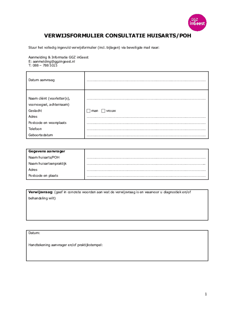 VERWIJSFORMULIER CONSULTATIE HUISARTS/POH Stuur het volledig ingevuld verwijsformulier (incl. bijlagen) via beveiligde mail naar: Aanmelding & Informatie GGZ inGeest E: aanmelding@ggzingeest.nl T: