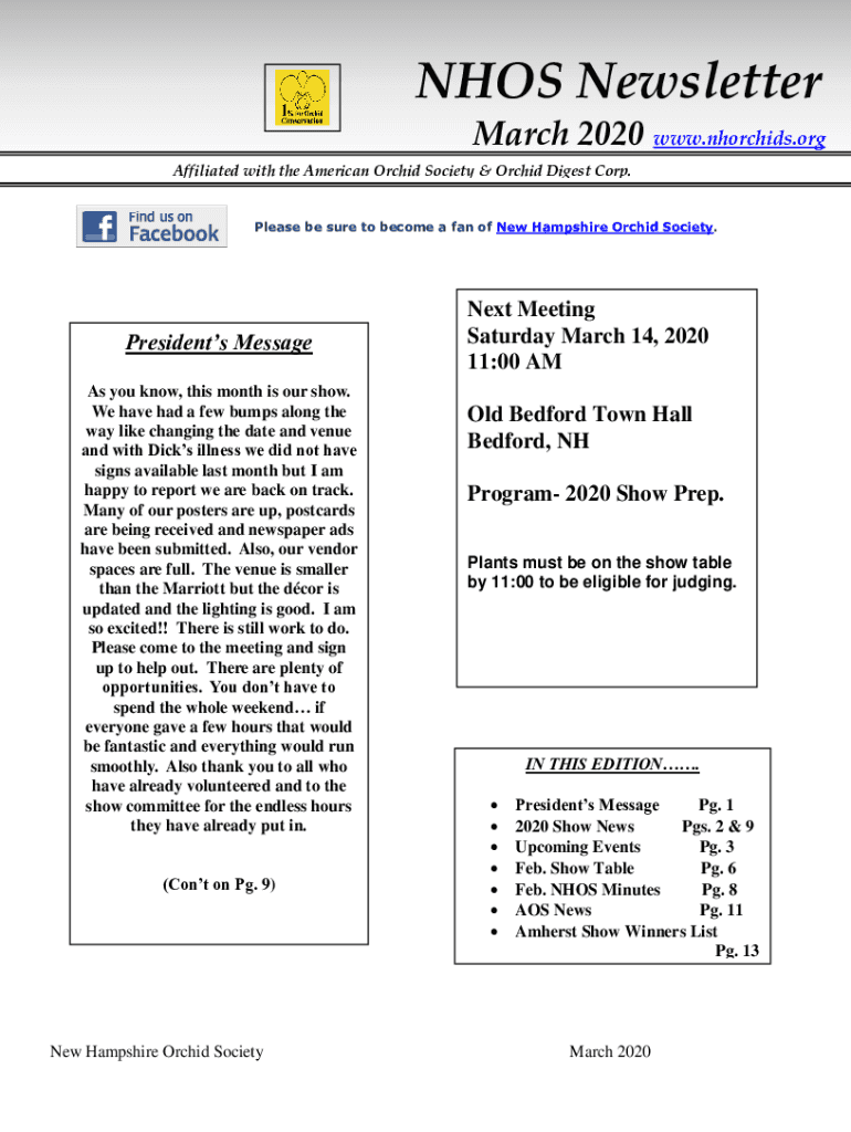 March 2020 www.nhorchids.orgPlease be sure to become a fan of New Hampshire Orchid Society. Affiliated with the American Orchid Society & Orchid Digest Corp. February 2015Please be