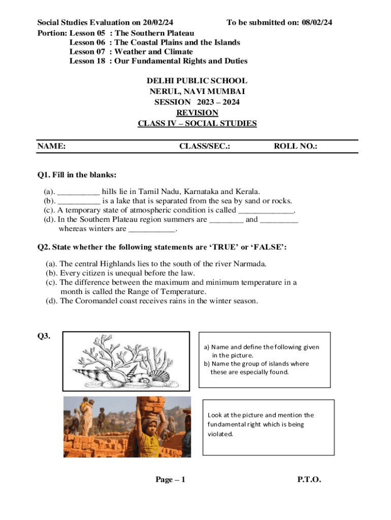 Social Studies Evaluation on 20/02/24 To be submitted on: 08/02/24 Portion: Lesson 05 : The Southern Plateau Lesson 06 : The Coastal Plains and the Islands Lesson 07 : Weather and Climate Lesson 18