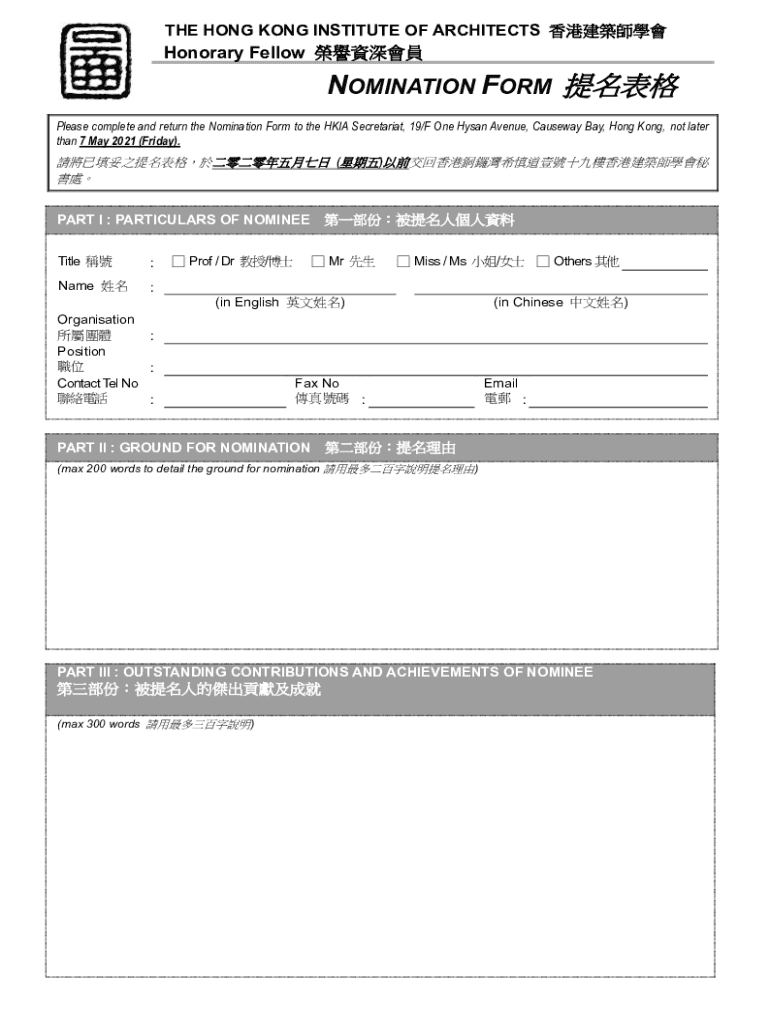 THE HONG KONG INSTITUTE OF ARCHITECTS Honorary Fellow NOMINATION FORM Please complete and return the Nomination Form to the HKIA Secretariat, 19/F One Hysan Avenue, Causeway Bay, Hong Kong, not later