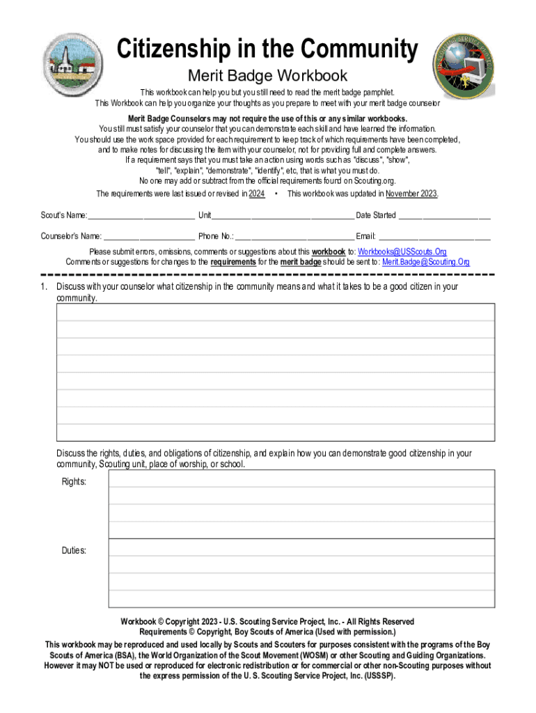 Citizenship in the Community Merit Badge Workbook This workbook can help you, but you still need to read the merit badge pamphlet. This Workbook can help you organize your thoughts as you prepare
