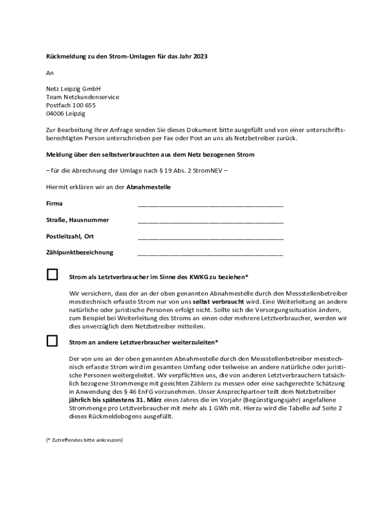 Rckmeldung zu den StromUmlagen fr das Jahr 2023 An Netz Leipzig GmbH Team Netzkundenservice Postfach 100 655 04006 Leipzig Zur Bearbeitung Ihrer Anfrage senden Sie dieses Dokument bitte ausgefllt