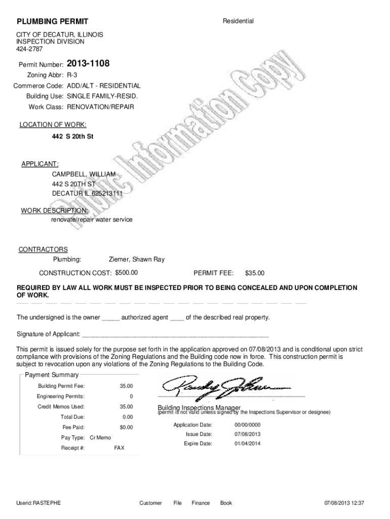 PLUMBING PERMITResidentialCITY OF DECATUR, ILLINOIS INSPECTION DIVISION 4242787 Permit Number:20131108Zoning Abbr: R3 Commerce Code: ADD/ALT RESIDENTIAL Building Use: SINGLE FAMILYRESID. Work Class: