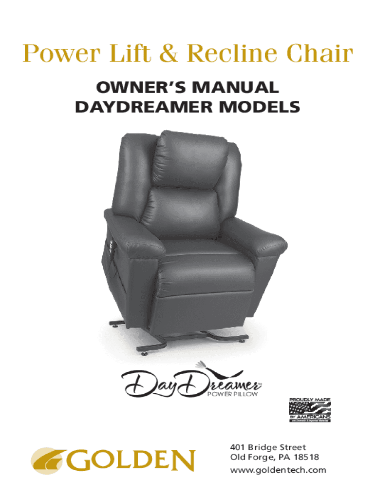 Power Lift & Recline Chair OWNERS MANUAL DAYDREAMER MODELSPOWER PILLOW401 Bridge Street Old Forge, PA 18518 www.goldentech.comDear Valued Customer, Thank you for purchasing this Golden Technologies