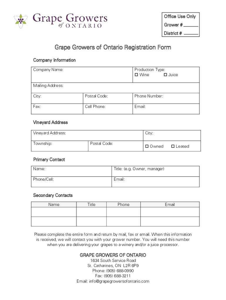 Office Use Only Grower # District #Grape Growers of Ontario Registration Form Company Information Company Name:Production Type: Wine JuiceMailing Address: City:Postal Code:Phone Number:Fax:Cell Phone:Email:Vineyard