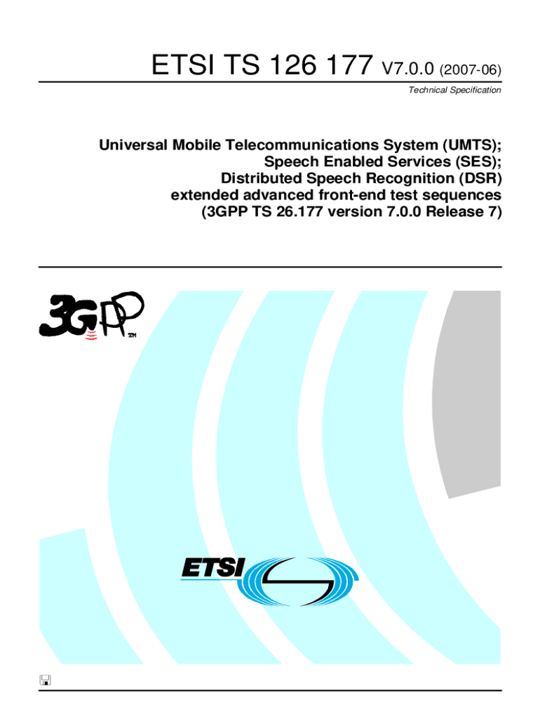 ETSI TS 126 177 V7.0.0 (200706) Technical SpecificationUniversal Mobile Telecommunications System (UMTS); Speech Enabled Services (SES); Distributed Speech Recognition (DSR) extended advanced frontend