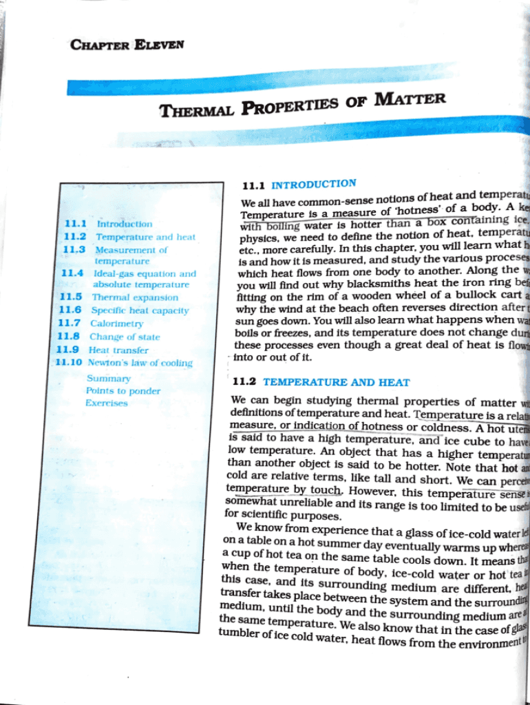 CHAPTER ELEVENrmTHERMAL PROPERTIES OF MATTER .\";11.1 INTRODUCTION11.1 Introduction 11.2 Temperature and hea t 11.3 MeasuremenL of 11.411 .5 11.6 11.7 11.8 11.9 II.IOtemperature ldeaJas equallon and