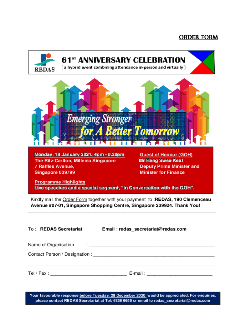 ORDER FORM61ST ANNIVERSARY CELEBRATION [ a hybrid event combining attendance inperson and virtually ]M Moonnddaayy,, 1188 JJaannuuaarryy 22002211,, 44ppm m 55..3300ppm m The RitzCarlton, Millenia
