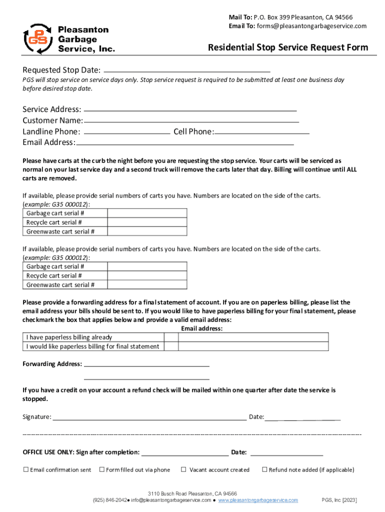 Mail To: P.O. Box 399 Pleasanton, CA 94566 Email To: forms@pleasantongarbageservice.comResidential Stop Service Request Form Requested Stop Date: PGS will stop service on service days only. Stop service