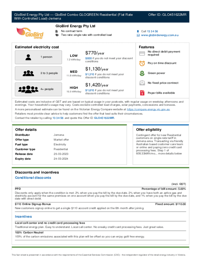 GloBird Energy Pty Ltd GloBird Combo GLOGREEN Residential (Flat Rate With Controlled Load)JemenaOffer ID: GLO451622MRGloBird Energy Pty Ltd No contract term Two rate: single rate with controlled loadEstimated