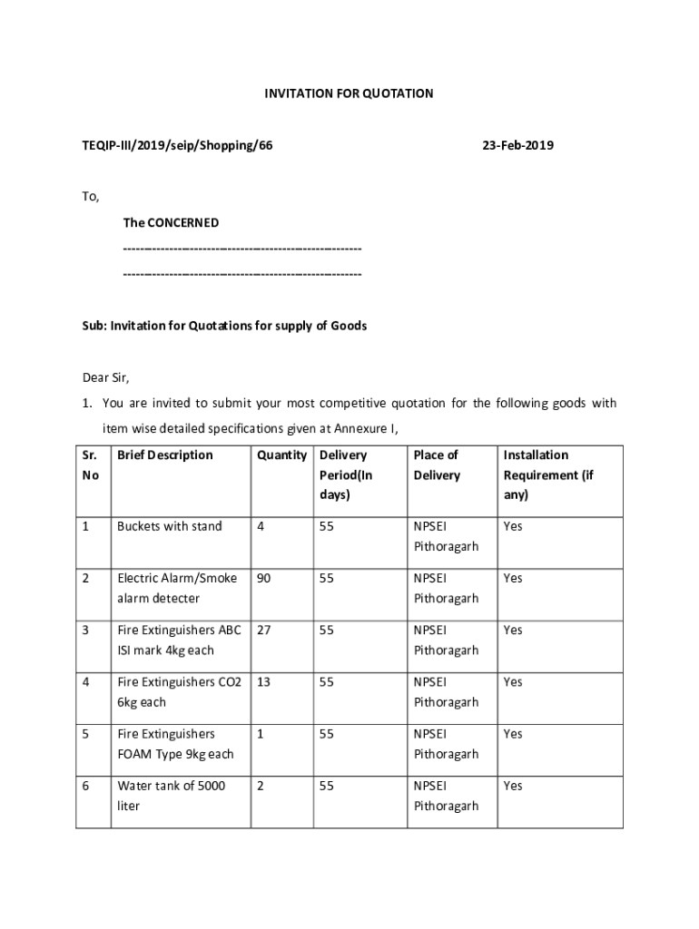 INVITATION FOR QUOTATIONTEQIPIII/2019/seip/Shopping/6623Feb2019To, The CONCERNED Sub: Invitation for Quotations for supply of GoodsDear Sir, 1. You are invited to submit your most competitive quotation