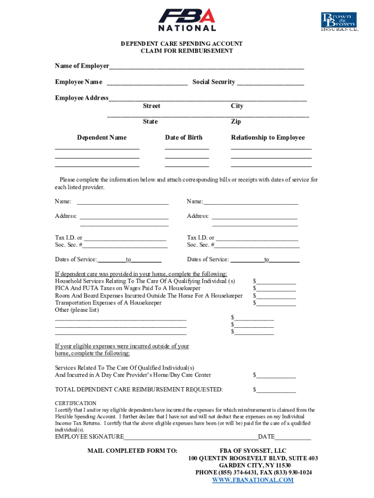 DEPENDENT CARE SPENDING ACCOUNT CLAIM FOR REIMBURSEMENTName of Employer___ Employee Name ___ Social Security ___ Employee Address___ Street City ___ State Zip Dependent Name___ ___ ___Date of Birth___
