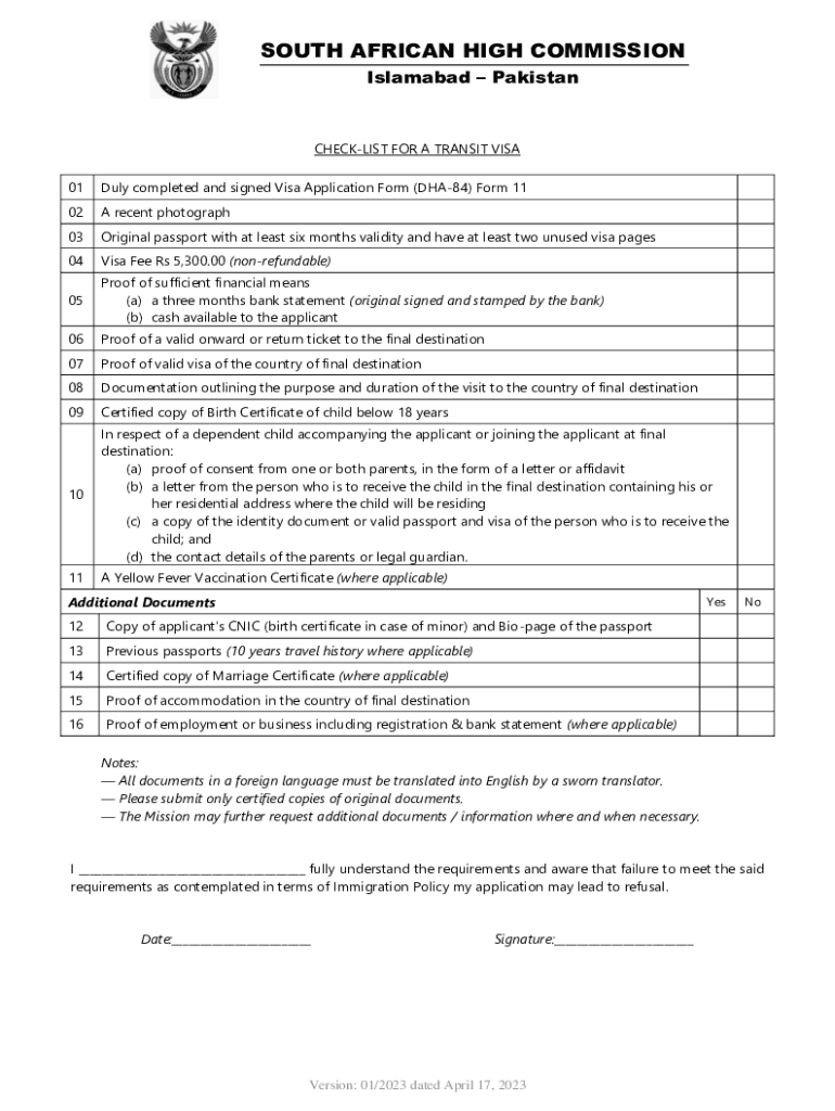 Islamabad PakistanCHECKLIST FOR A TRANSIT VISA