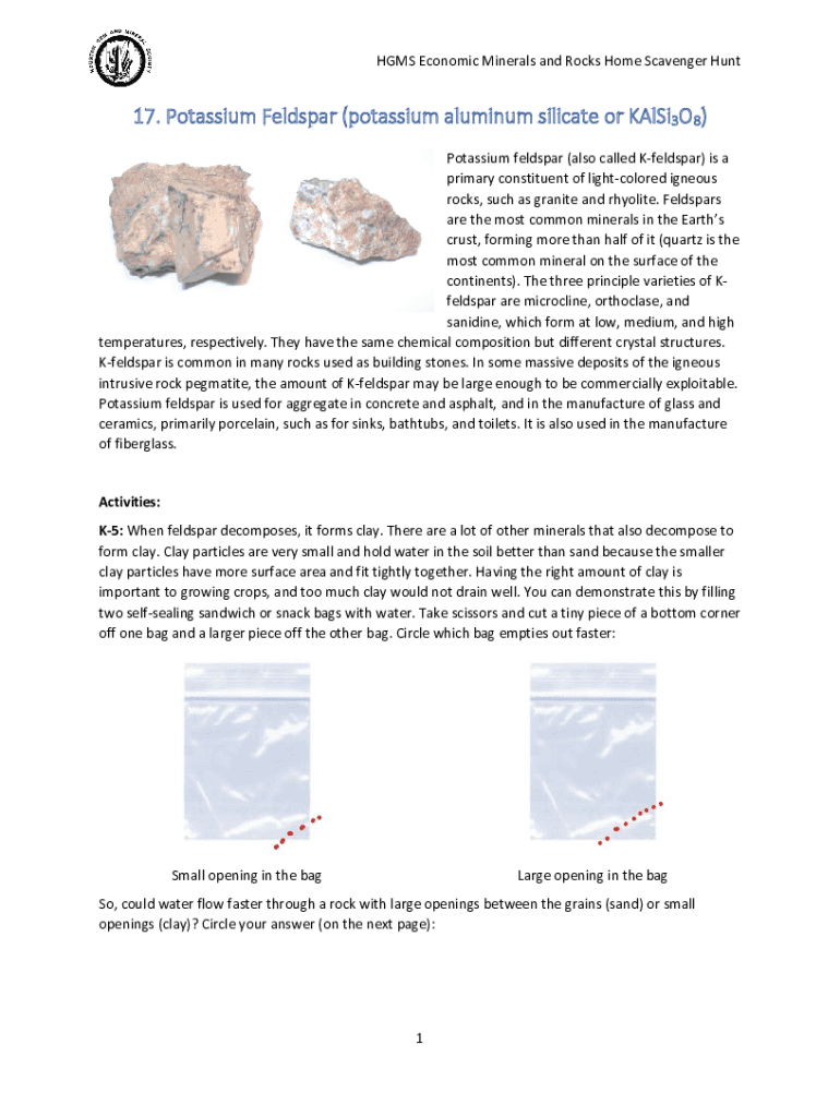 HGMS Economic Minerals and Rocks Home Scavenger Hunt17. Potassium Feldspar (potassium aluminum silicate or KAlSi3O8) Potassium feldspar (also called Kfeldspar) is a primary constituent of lightcolored