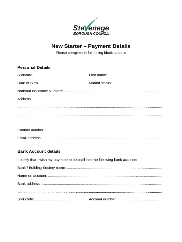 Instructions for the form Stevenage Borough Council - Payment Ination