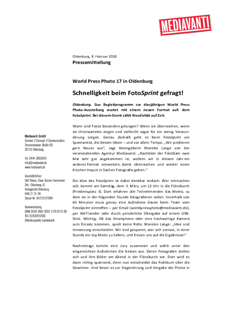 Oldenburg, 8. Februar 2018PressemitteilungWorld Press Photo 17 in OldenburgSchnelligkeit beim FotoSprint gefragt!Oldenburg.DasBegleitprogrammzurdiesjhrigenWorldPressPhotoAusstellungwartetmiteinemneuenFormatauf:demFotoSprint. Bei diesem Event zhlt Kreativitt auf Zeit.Wann sind Fotos besonders gelungen? Wenn sie berraschen, wennsieUnerwarteteszeigenundvielleichtsogarfreinwenigVerwunderungsorgen.Genaudeshalb