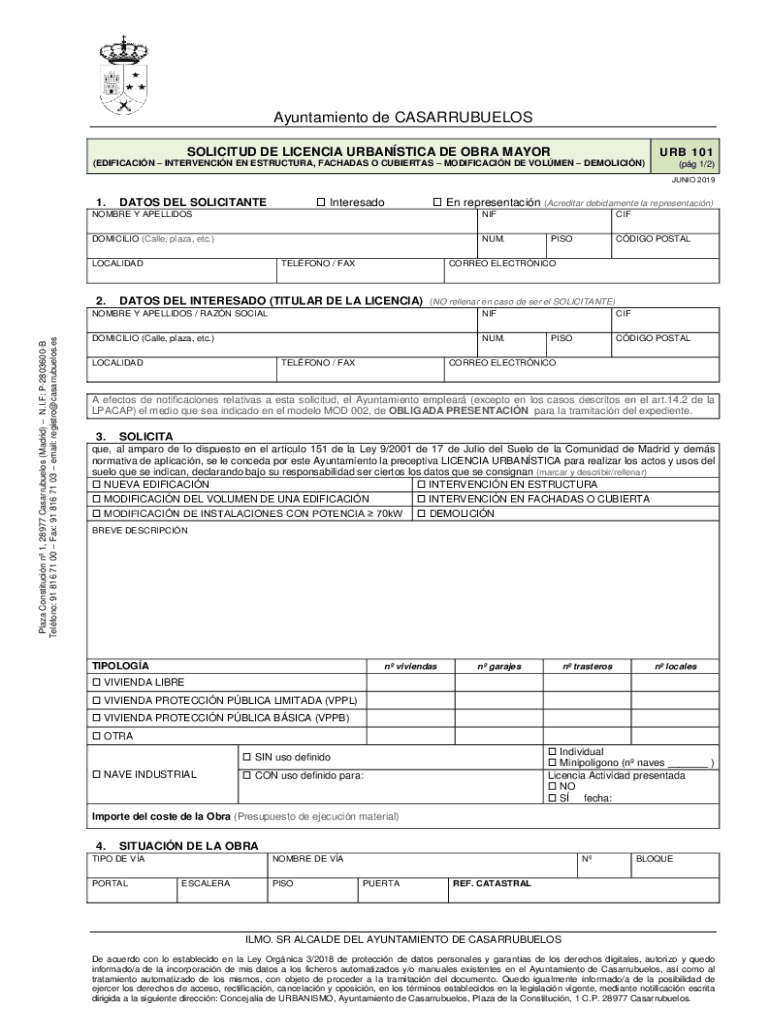 Ayuntamiento de CASARRUBUELOS URB 101SOLICITUD DE LICENCIA URBANSTICA DE OBRA MAYOR (EDIFICACIN INTERVENCIN EN ESTRUCTURA, FACHADAS O CUBIERTAS MODIFICACIN DE VOLMEN DEMOLICIN)(pg 1/2) JUNIO 20191.