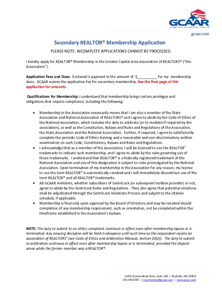 I hereby apply for REALTOR Membership in the Greater Capital Area Association of REALTORS (the