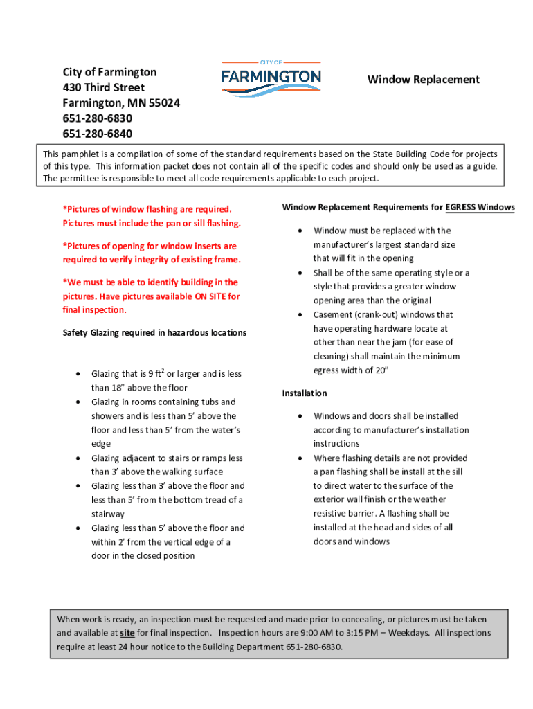 City of Farmington 430 Third Street Farmington, MN 55024 6512806830 6512806840Window ReplacementThis pamphlet is a compilation of some of the standard requirements based on the State Building Code