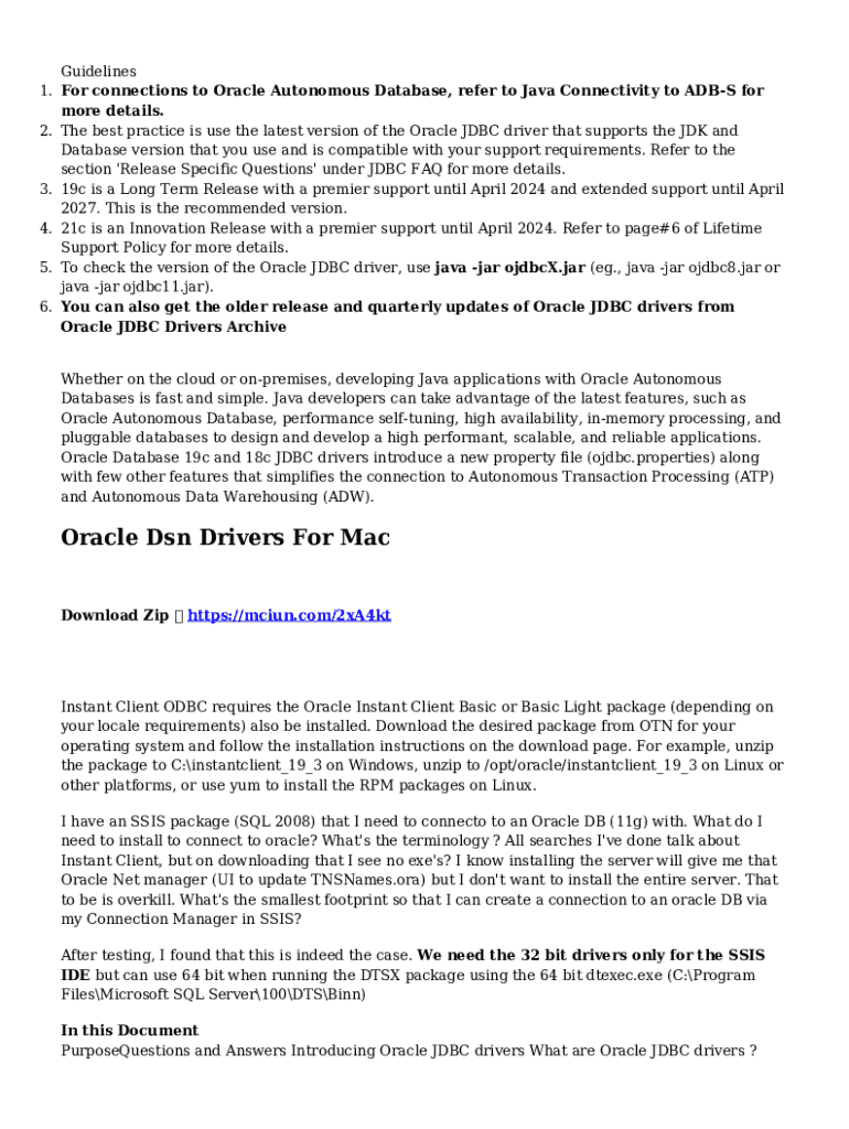 Guidelines 1. For connections to Oracle Autonomous Database, refer to Java Connectivity to ADBS for more details. 2. The best practice is use the latest version of the Oracle JDBC driver that supports