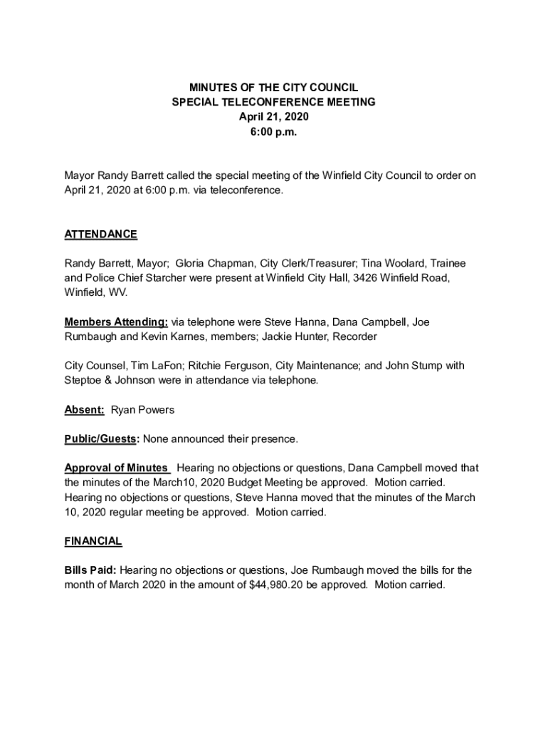 MINUTES OF THE CITY COUNCIL SPECIAL TELECONFERENCE MEETING April 21, 2020 6:00 p.m.Mayor Randy Barrett called the special meeting of the Winfield City Council to order on April 21, 2020 at 6:00 p.m.