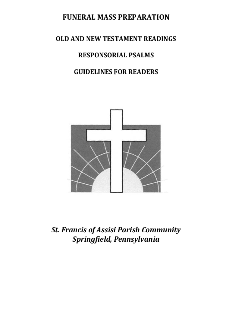 FUNERAL MASS PREPARATION OLD AND NEW TESTAMENT READINGS RESPONSORIAL PSALMS GUIDELINES FOR READERSSt. Francis of Assisi Parish Community Springfield, PennsylvaniaSection One: Scripture Readings2The