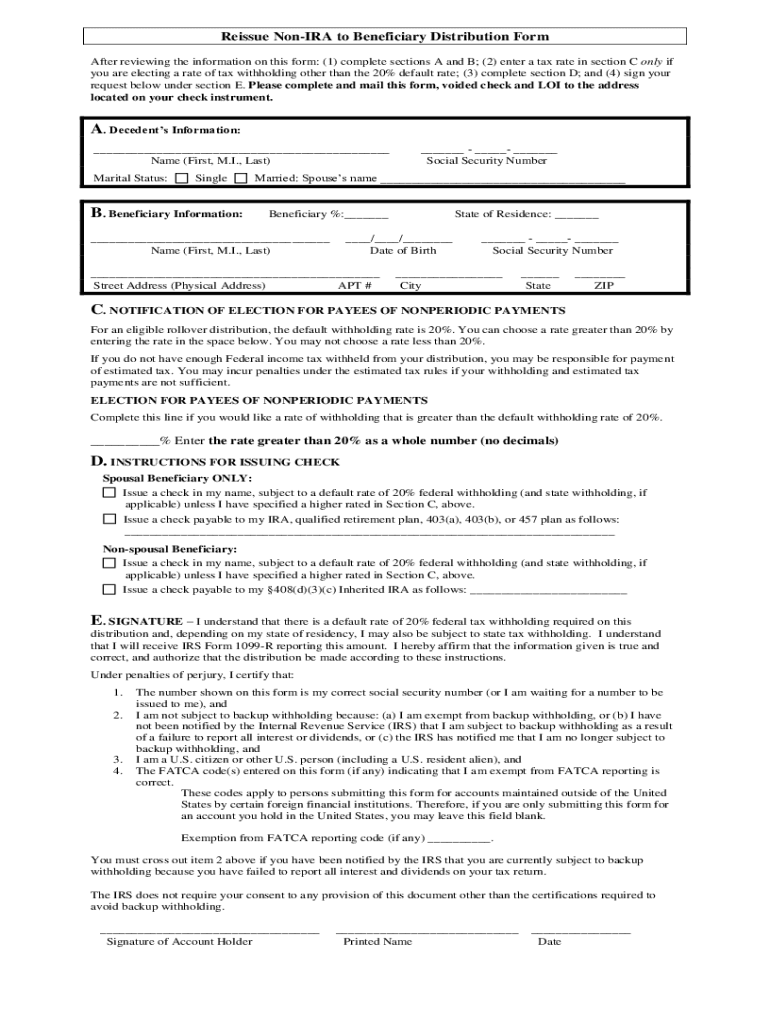 Reissue NonIRA to Beneficiary Distribution Form After reviewing the information on this form: (1) complete sections A and B; (2) enter a tax rate in section C only if you are electing a rate of tax