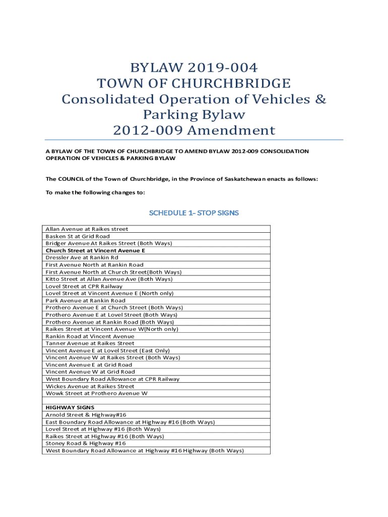 BYLAW 2019004 TOWN OF CHURCHBRIDGE Consolidated Operation of Vehicles & Parking Bylaw 2012009 Amendment A BYLAW OF THE TOWN OF CHURCHBRIDGE TO AMEND BYLAW 2012009 CONSOLIDATION OPERATION OF VEHICLES
