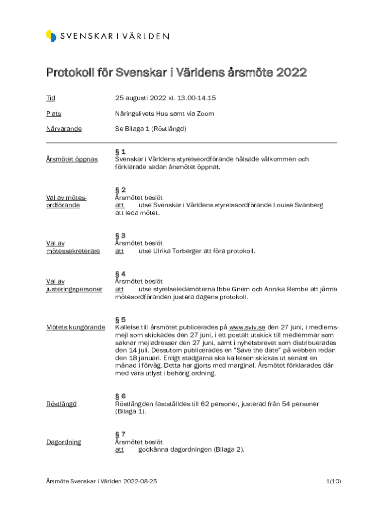Protokoll fr Svenskar i Vrldens rsmte 2022 Tid25 augusti 2022 kl. 13.0014.15PlatsNringslivets Hus samt via ZoomNrvarandeSe Bilaga 1 (Rstlngd)rsmtet ppnas1 Svenskar i Vrldens styrelseordfrande hlsade